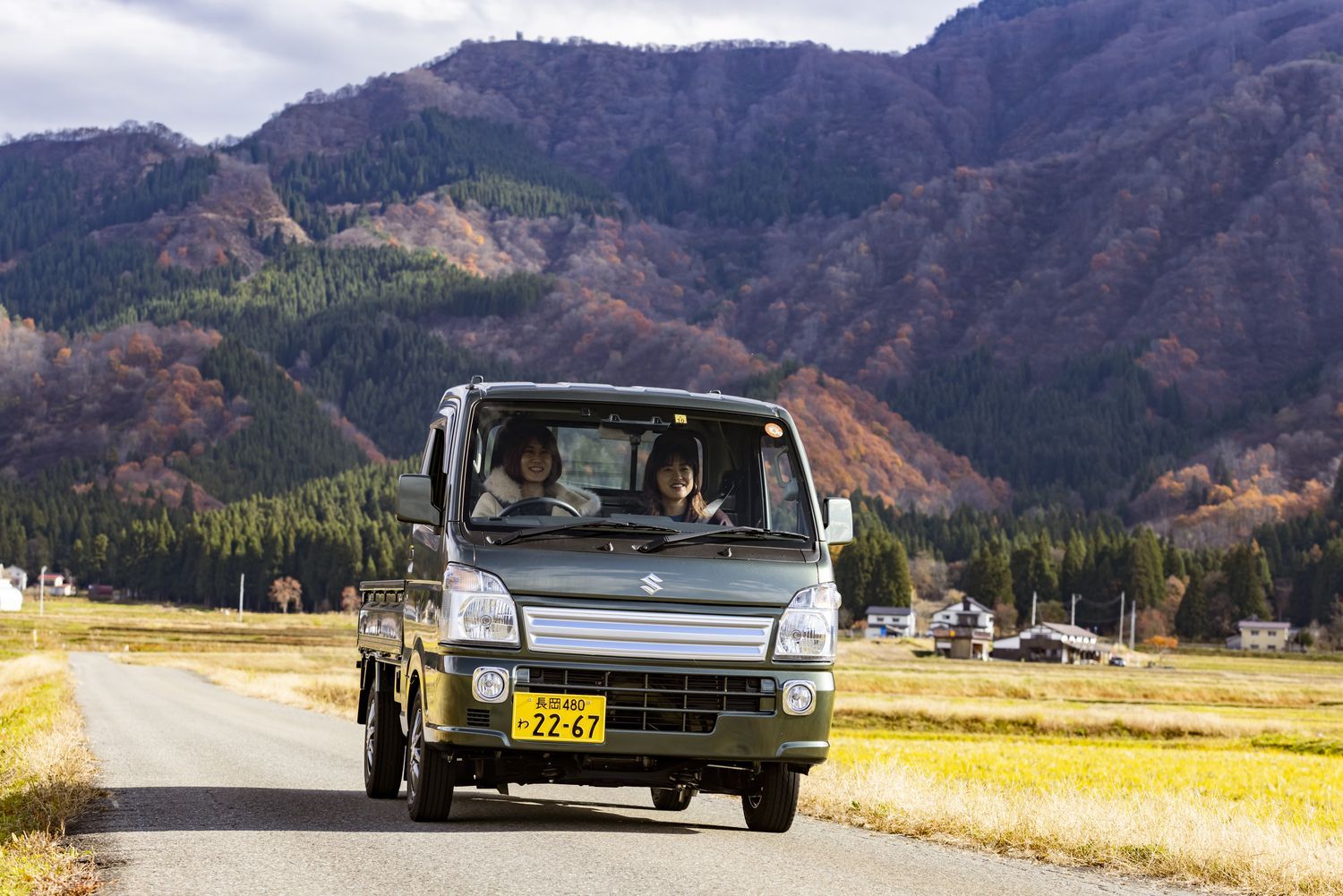 旅先での相棒は、グリーンが映える軽トラ。
