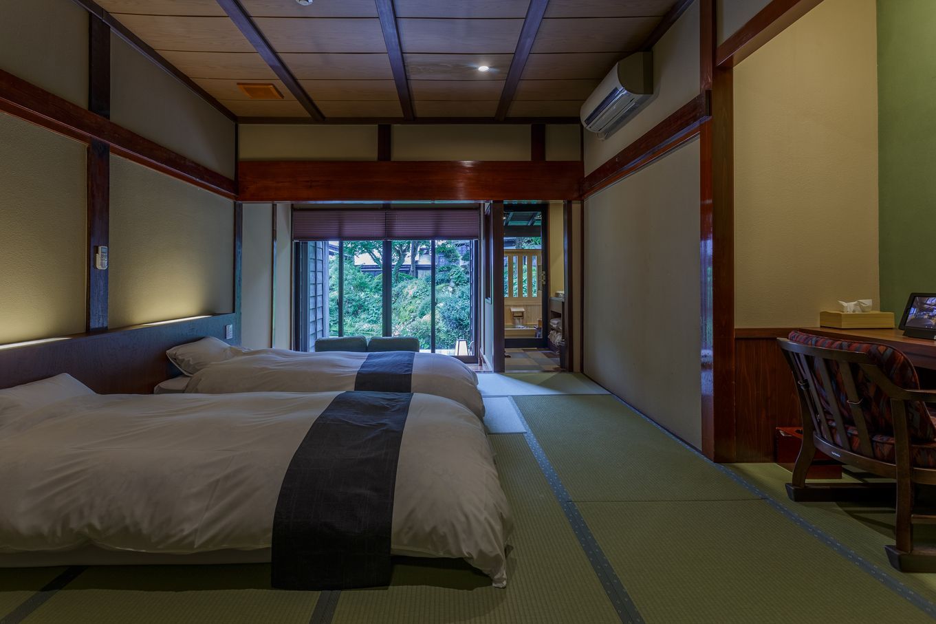 畳の匂いや肌触りにホッとし、半露天風呂に浸かりながら旅の疲れを癒すひとときをお過ごしください。